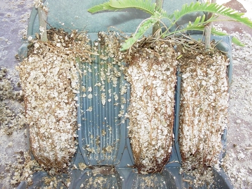 Another method involves using specially designed planting containers that have vertical or horizontal ridges or numerous slits or openings around the sides of the containers or both. The openings create dry or air spaces that roots cannot grow across. The resulting drying of the root tip serves to prune the tip and encourages the formation of lateral roots. This process, called air root pruning provided the same results as painting containers with “SpinOut.” The purpose of utilizing a chemical and/or air root pruning is to inhibit circling roots and encourages the development of a more dispersed root system (see photos below).