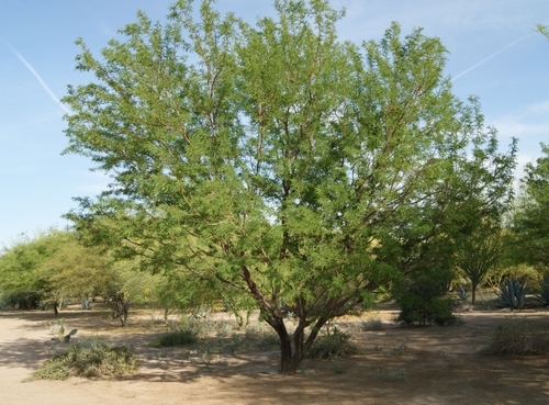 Prosopis seedless hybrid ‘AZT™’ is among the more popular and widely used trees in the desert landscape palette. It is not difficult to understand its popularity among landscape professionals given the trees’ qualities. This tree produces no seed pods, making them ideal for landscape applications from pedestrian patio and walkways to streetscapes, park plantings, commercial and residential landscapes. The form and texture of Prosopis seedless hybrid ‘AZT™’ blend almost seamlessly with surrounding native Sonoran desert trees and shrubs. They are used as theme trees along streets and commercial projects, as screens, wind breaks or barrier plantings, as transition trees back to native species in re-vegetation projects or any landscape applications where ample shade is desired and seed pod litter is a concern. At maturity, Mesquites can be up to 30 feet tall and as wide with symmetrical, dome- shaped, spreading canopies. The foliage is lacy and fern-like with compound leaves consisting of anywhere from 20 to 40 leaflets. Cold hardy to 10 to 15 degrees F, they can be planted throughout most regions of the desert southwest.